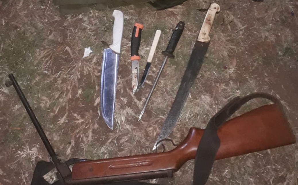 Por tal motivo, los uniformados se dirigieron al lugar y sorprendieron a los hombres que al notar la presencia policial, se agazaparon en una vivienda del asentamiento. Allí, solicitaron a los mismos que salieran del inmueble y con orden del juzgado interviniente, allanaron el lugar donde constataron la presencia de dos bovinos sin vida, utensilios de cocina, un machete y un rifle de aire comprimido presuntamente utilizado para matar a los animales.