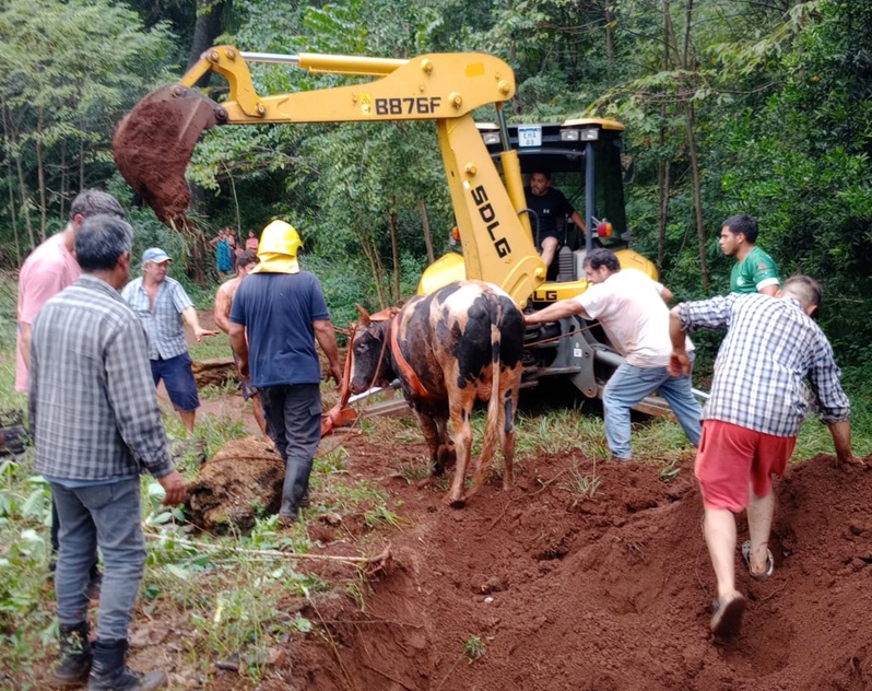 Ante esta situación, se solicitó la colaboración del municipio, que dispuso una retroexcavadora para ampliar el área de trabajo. Con esta herramienta y el esfuerzo conjunto de los efectivos, el propietario del animal y vecinos del barrio, finalmente se logró liberar al vacuno sin que presentara lesiones.