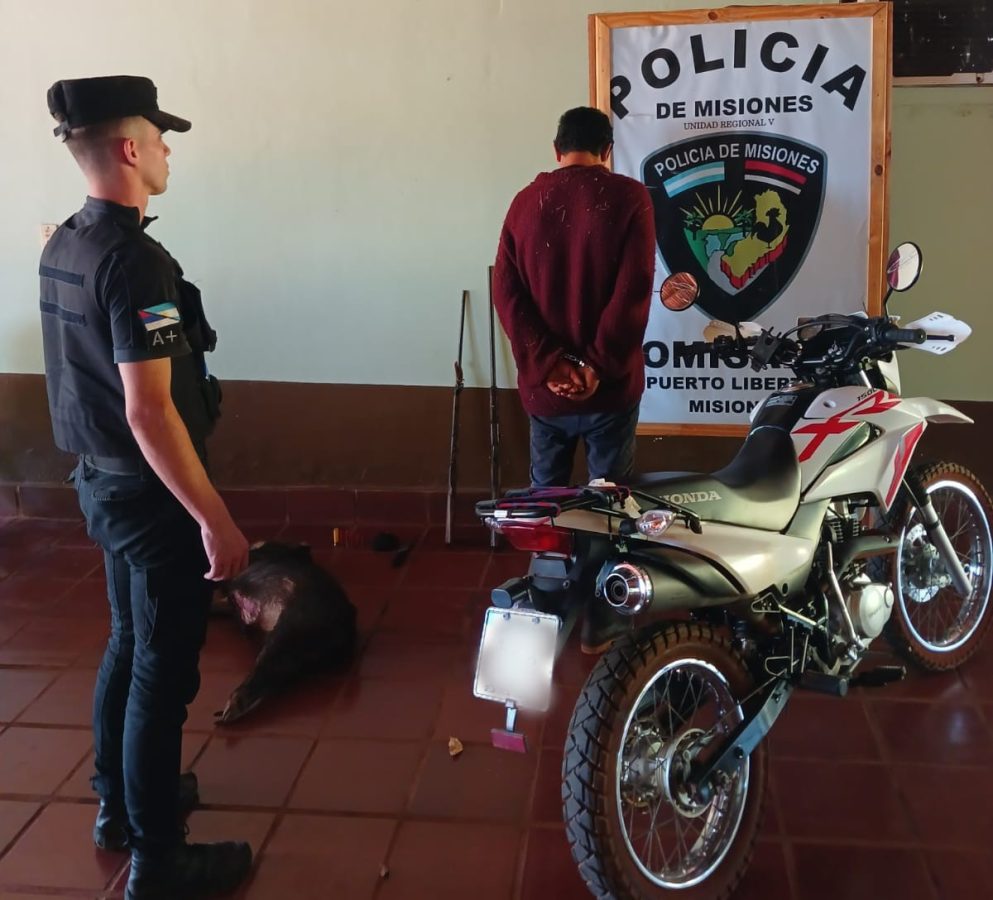 Durante una recorrida por el lugar, los uniformados interceptaron a un hombre de 31 años, quien se hallaba en el interior del monte. En su poder se secuestraron dos escopetas de distintos calibres sin marca ni numeración visible, municiones, un cuchillo de grandes dimensiones, una motocicleta y un ejemplar de fauna silvestre producto de la caza.