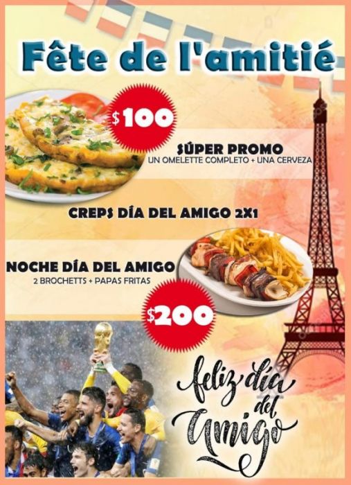 Colectividad Francesa: espera con servicio de Restaurant y kiosko. Además, para festejar el Día del Amigo (Féte de l´amitié) te ofrece varias super promos (omelette completo + una cerveza, creps 2 x 1, y por la noche 2 brochettes + papas fritas) a precios increíbles.