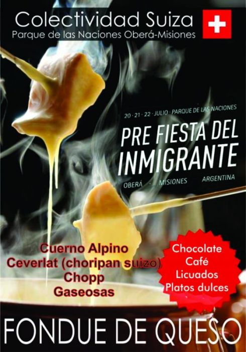 Colectividad Suiza: espera con sus platos tíicos!! En la casita de chocolate se va a estar sirviendo fondüe de queso y chocolate como todos los domingos, además café, licuados y cosas dulces. En el kiosco van a tener cuerno alpino, cervelat (choripán suizo) y gaseosas, chopp, agua.
