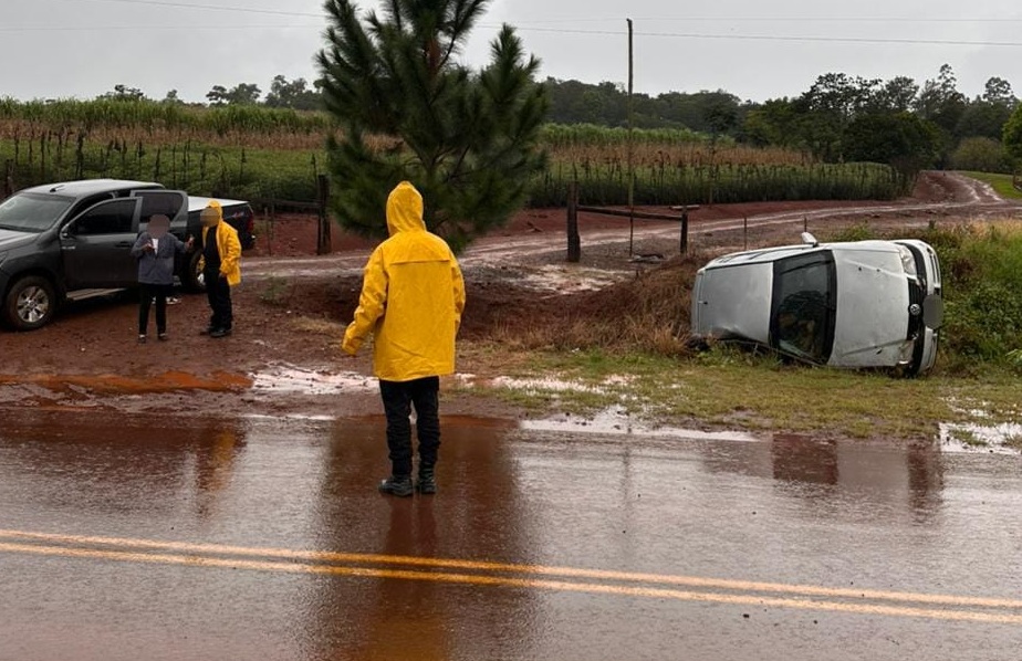 Por causas que se investigan, un Volkswagen Gol que circulaba en sentido San Pedro–Pozo Azul, conducido por Elmo G. (61), perdió el control y salió de la cinta asfáltica, quedando volcado sobre su lateral izquierdo. En el vehículo viajaba como acompañante Ernestina D. (52).