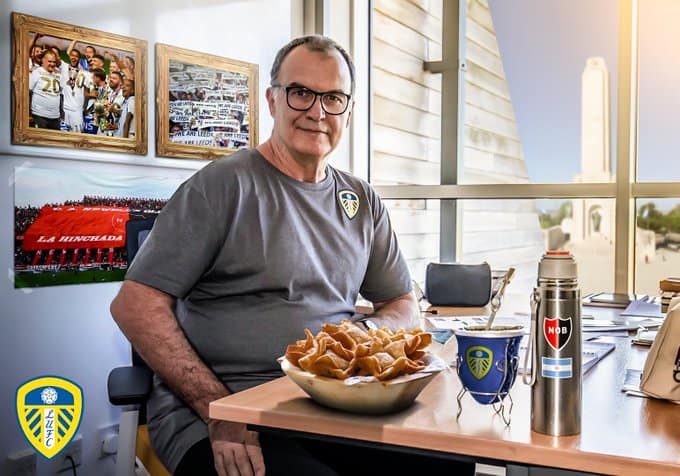 Marcelo Bielsa apareció este miércoles en una imagen recreada por Leeds United, de Inglaterra, con mate, pastelitos y un termo, con el escudo de Newell's Old Boys y la bandera argentina, a modo de celebración del Día de la Tradición.