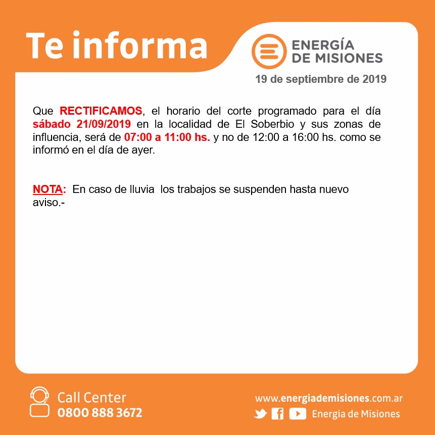 Energía de Misiones, a través de un comunicado, informó que el horario del corte para el día sábado 21-09-2019, será de 07 a 11 y no de 12 a 16 hs como se había comunicado.