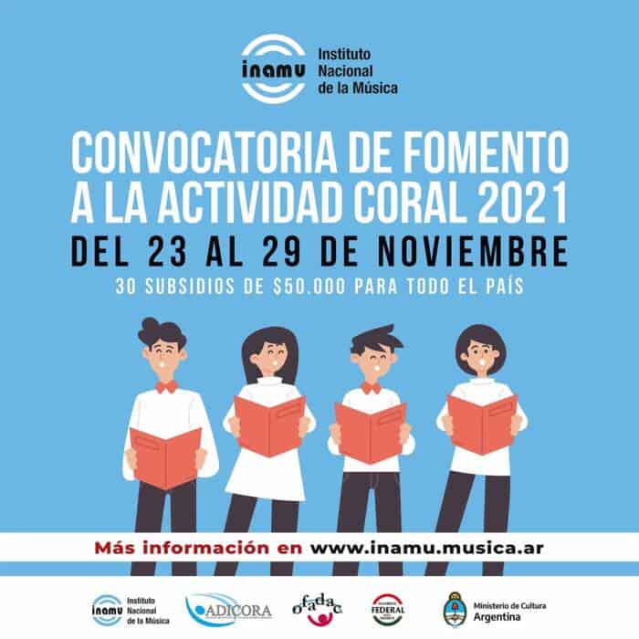 El Instituto Nacional de la Música (INAMU), con la participación de la Organización Federada Argentina de Actividades Corales (OFADAC) y la Asociación de Directores de Coro de la República Argentina (ADICORA), abre la Convocatoria de Fomento a la Actividad Coral 2021. Serán beneficiados 30 coros con subsidios de $50.000.