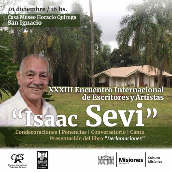 El miércoles 1 de diciembre a partir de las 16 horas, tendrá lugar el XXXIII Encuentro Internacional de Escritores y Artistas organizado por la Sociedad Argentina de Escritores filial Misiones y el Consejo Internacional Todas las Sangres, que en esta ocasión llevará el nombre de "Isaac Sevi", en honor al escritor, docente, político y artífice cultural del NEA. La cita es en el Salón de los Escritores Misioneros ubicado dentro de la Casa Museo Horacio Quiroga, en el municipio de San Ignacio.