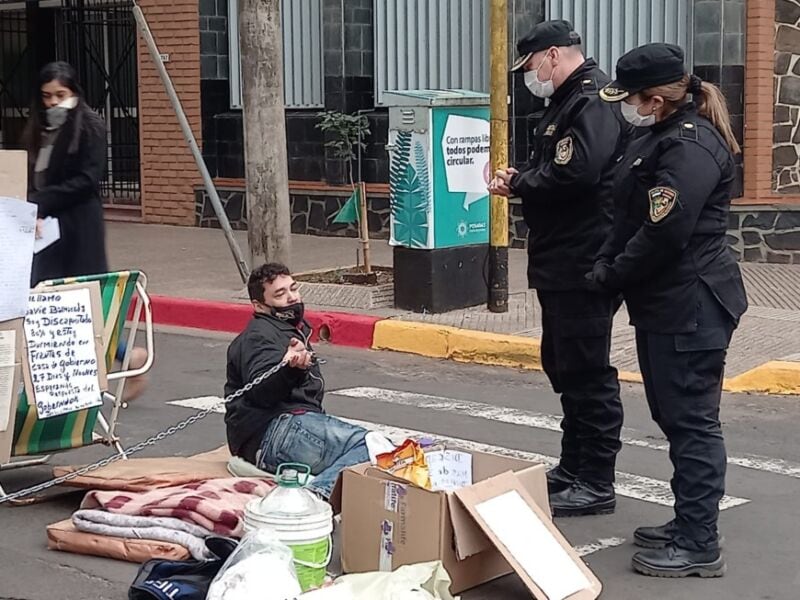 El tránsito sobre la intersección entre las calles Buenos Aires y Bolívar de Posadas permanece interrumpido por la protesta de un hombre que está encadenado. Según trascendidos, pide que le otorguen una vivienda por su condición de discapacidad.