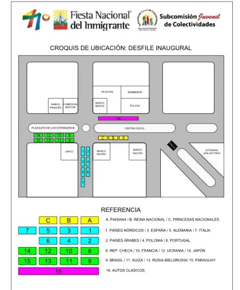En el escenario mayor se podrá ver el cuadro apertura a cargo de las colectividades, dando inicio al acto protocolar donde se escucharán las palabras del representante de la colectividad portuguesa en representación de todas las colectividades; la presidente de la Federación de Colectividades Marta Wieremiey; la directora nacional de Migraciones, María Florencia Carignano; el Intendente Municipal Carlos Fernández; y finalmente, del gobernador Oscar Herrera Ahuad.