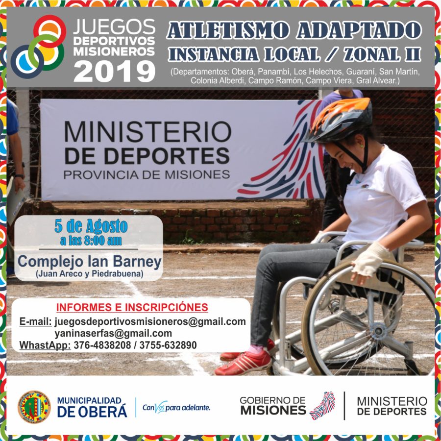 El próximo lunes 5 de agosto a partir de las 8 se desarrollará en el Polideportivo Ian Barney las instancias locales de Atletismo Adaptado de los Juegos Deportivos Misioneros.