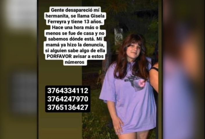 Gisela Ferreyra de 13 años se ausentó este miércoles de su domicilio ubicado en el barrio Itaembé Miní de la capital provincial. Los padres radicaron la denuncia en la seccional 9 de Posadas.