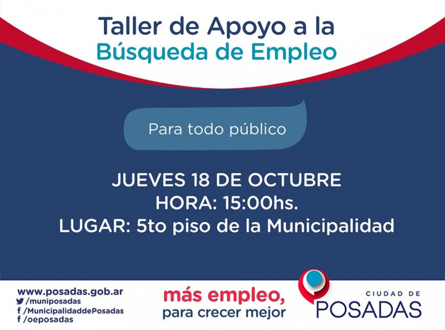 La Oficina Municipal de Empleo de Posadas dictará este jueves un taller gratuito de apoyo a la búsqueda de empleo. Será a las 15 horas en el SUM de la Municipalidad.