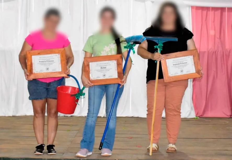La actividad se realizó el sábado en el predio municipal como parte de las celebraciones por el 8 de marzo. Durante la jornada se llevó adelante una coronación simbólica de reina y princesas y distintas propuestas recreativas destinadas a homenajear a las mujeres de la comunidad. Las fotografías del momento en que se entregaban artículos de limpieza a algunas participantes fueron las que encendieron el debate público una vez que fueron compartidas en redes sociales.