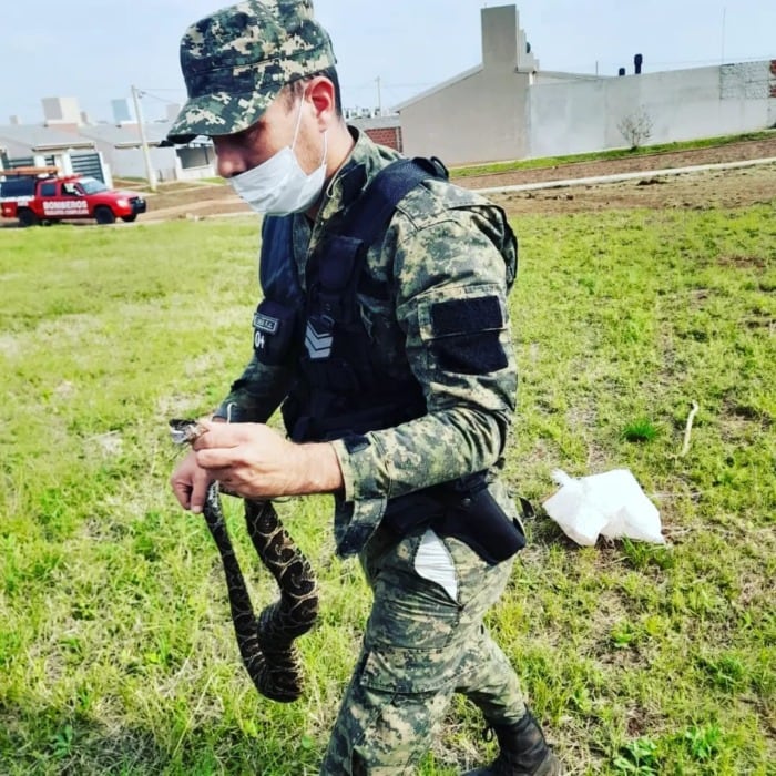 Los policías fueron requeridos en las calles Los Geranios y Los Canarios, debido a que según los vecinos había una serpiente agresiva. Una vez allí, el personal idóneo con mucho cuidado capturó y resguardó al reptil que estaba en un espacio verde de dicho barrio.