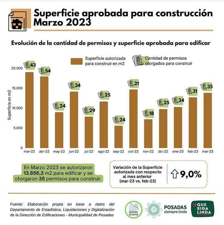 En marzo pasado, desde la Municipalidad de Posadas se entregaron 35 certificados de permisos de obra. Esto equivale a casi 14.000 m2 autorizados para construcción; así lo informó la Oficina de Gestión de Datos de Posadas.