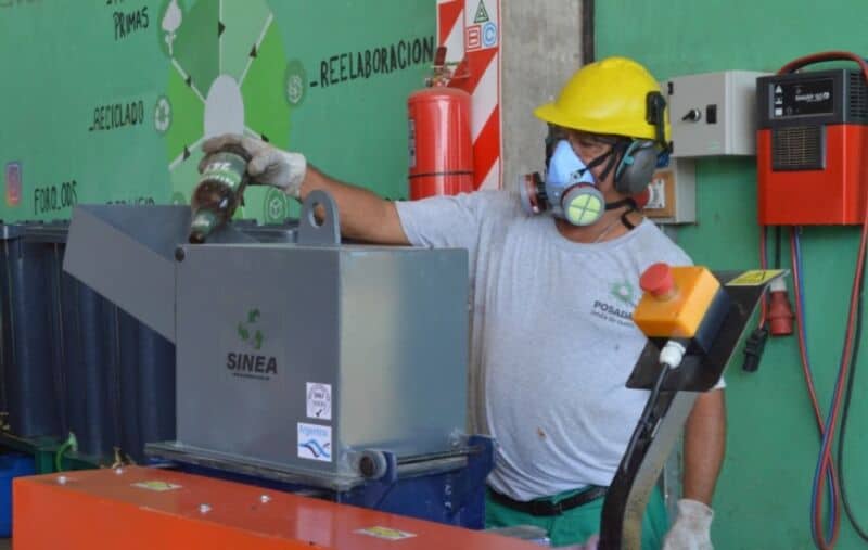 El proceso comienza con el acopio de botellas en los 280 contenedores de recolección diferenciada, como así también en los 12 Ecopuntos. Luego, se trasladan a la planta localizada en Nemesio Parma para ser molido.