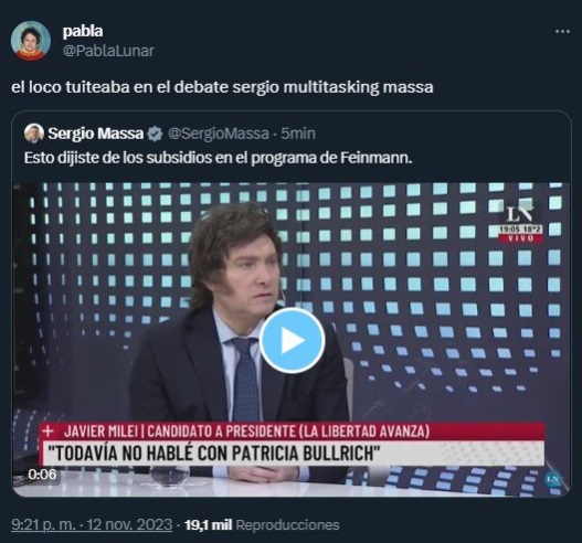 Los usuarios destacaron la coincidencia del debate con el momento en que la cantante Taylor Swift realizaba su último show en el estadio de River y la furia del candidato libertario ante las consultas del ministro de Economía, así como la tendencia de la pregunta de Sergio Massa, "Por sí o por no".