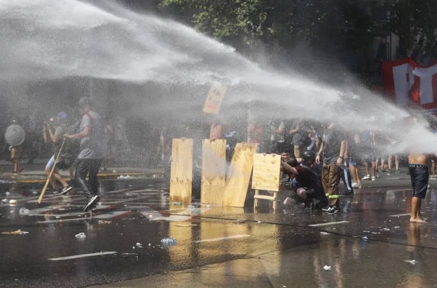 Guarecidos con bloques de madera, los manifestantes armaron bombas Molotov y enfrentaron a la Policía, que respondió con el camión hidrante y balas de goma.