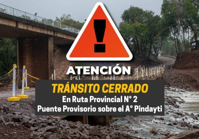 La Dirección Provincial de Vialidad (DPV) informó que tras la suba del cauce del arroyo Pindaytí se determinó el corte total del paso vehicular y peatonal sobre el puente provisorio, por ruta provincial 2. La medida es para resguardar la seguridad de quienes allí transitan. La construcción del nuevo puente se dará inicio a la brevedad.