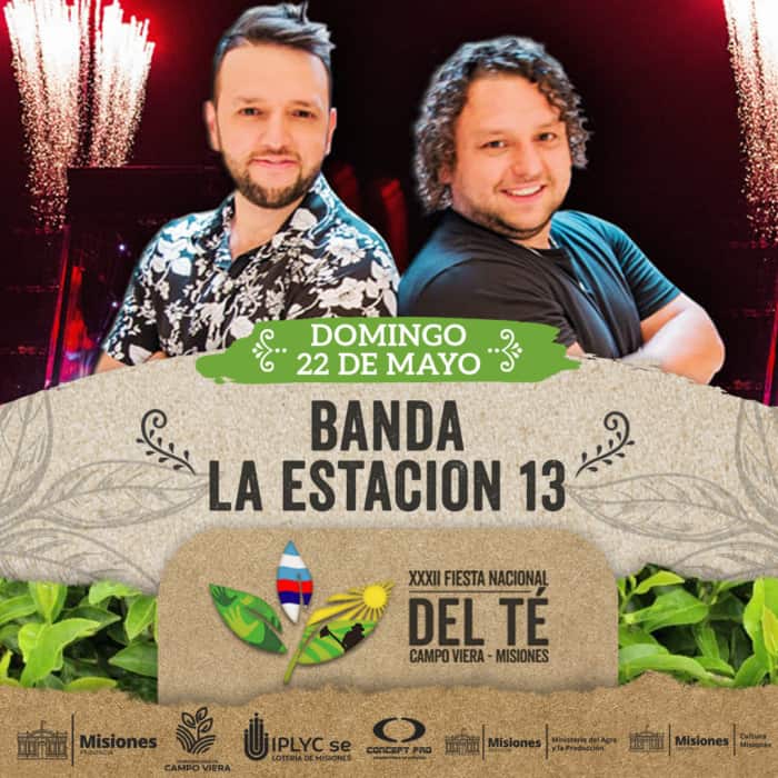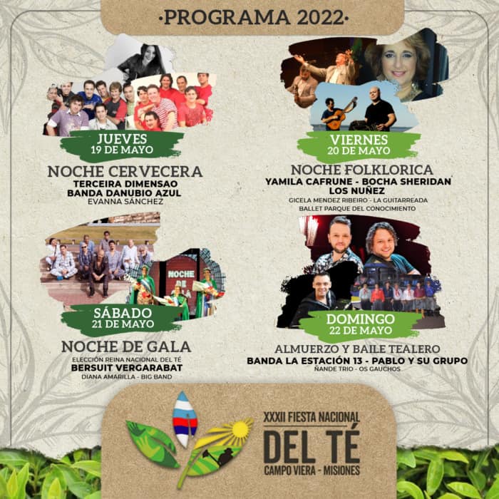 El presidente de la Comisión Organizadora de la Fiesta Nacional del Té, Darío Schauer confirmó la grilla de artistas para el inicio de la Fiesta Nacional del Té (19/05) denominada «Noche Cervecera» con Danubio Azul y Evana Sánchez y Tercera Dimensión. En tanto que el viernes 20 será una noche más folclórica con la presentación de Ballet municipales, el Ballet Folclórico del Parque del Conocimiento, Yamila Cafrune, Bocha Scheridan, Gisela Mendez Ribeiro, La Guitarreada y Los Nuñez.
