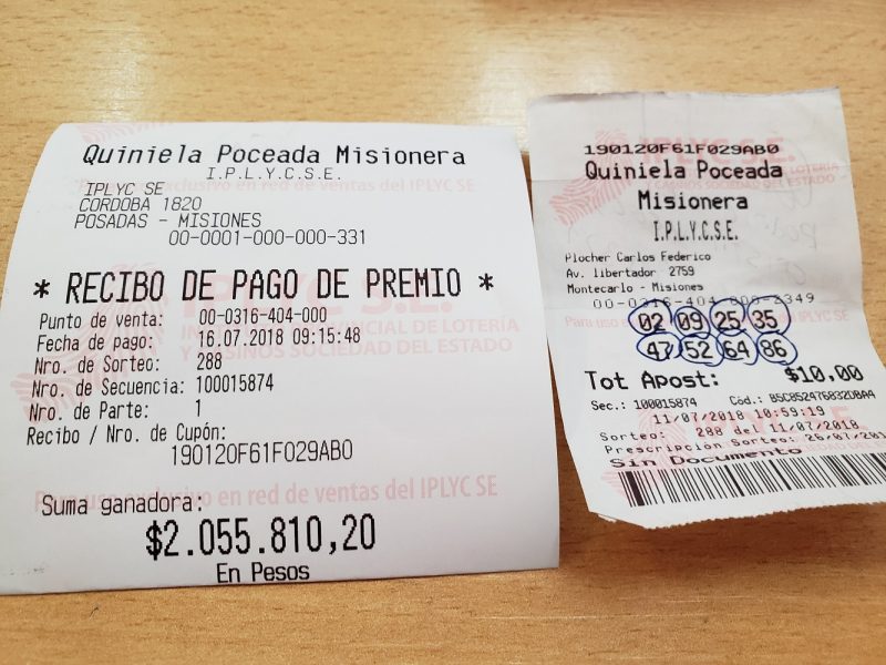 Pero el día de “suerte” hizo la misma boleta y como le sobraron diez pesos, le dijo a la empleada que confeccionara otra, con su propio pálpito. Y esa fue la que se llevó 2.055.810 pesos, convirtiéndolo en el séptimo ganador del premio mayor desde agosto del año pasado, cuando se relanzó el juego. Con la original se llevó otros 1.800 pesos en el tercer premio, que ese día repartió 39.893 pesos entre 25 apostadores.